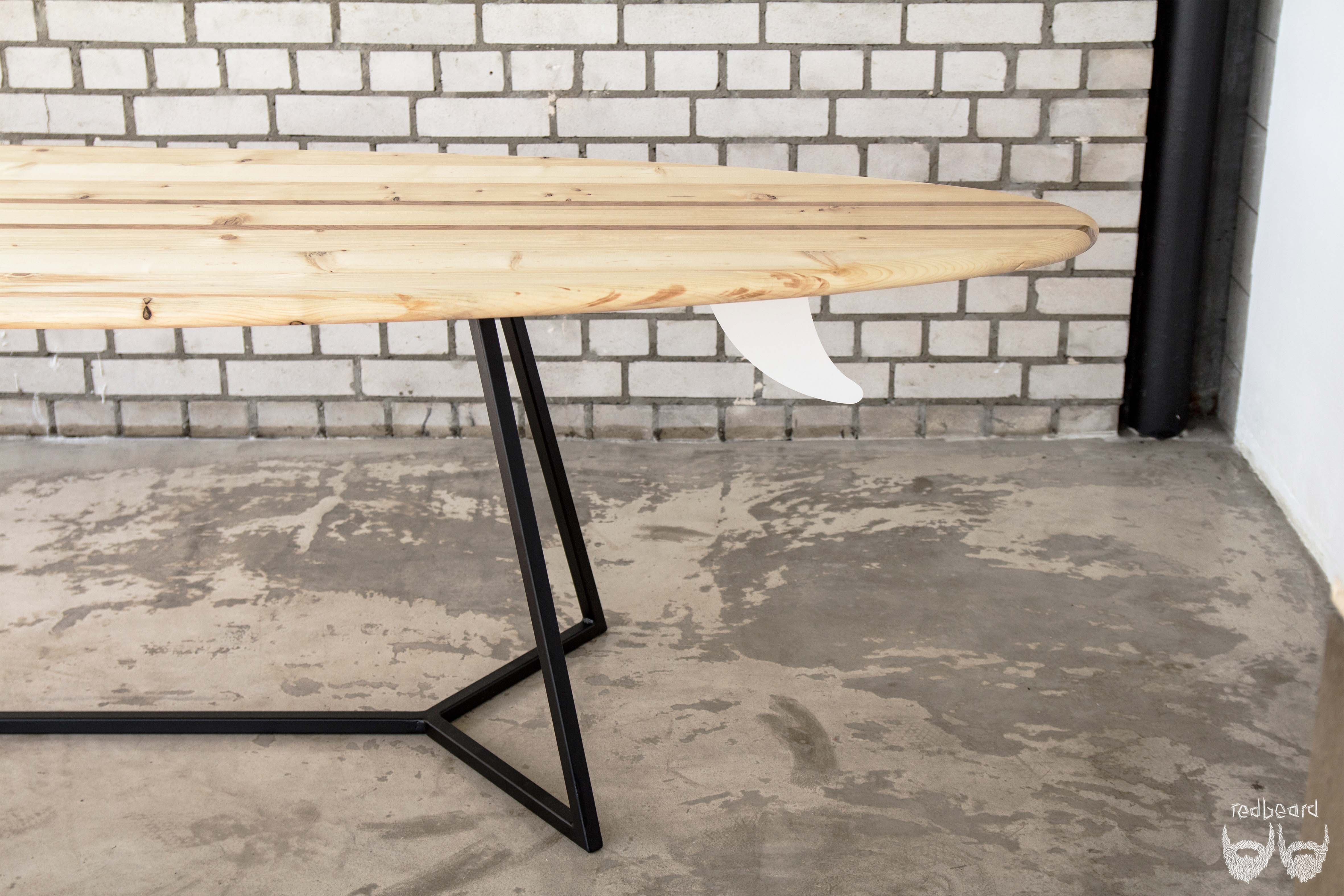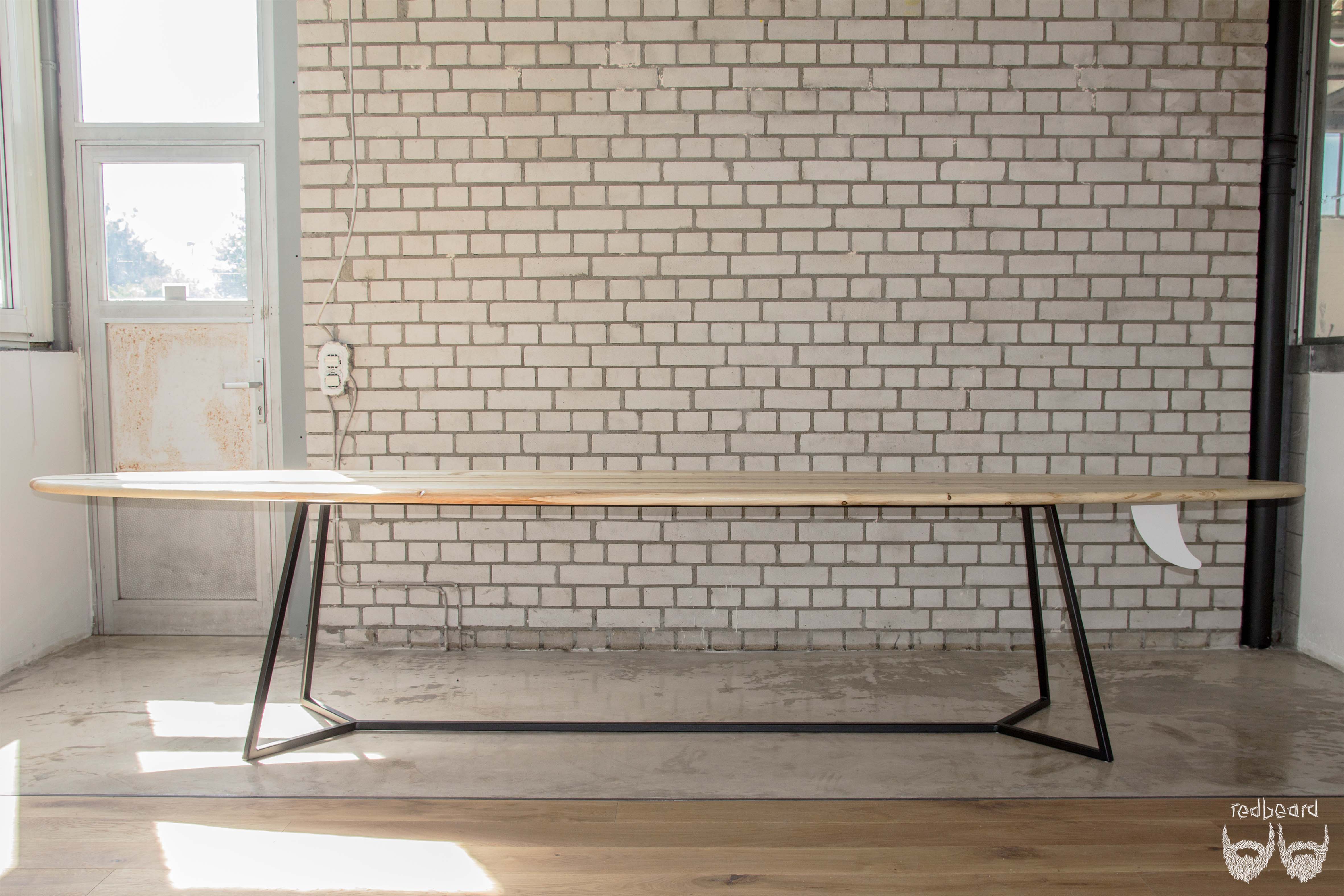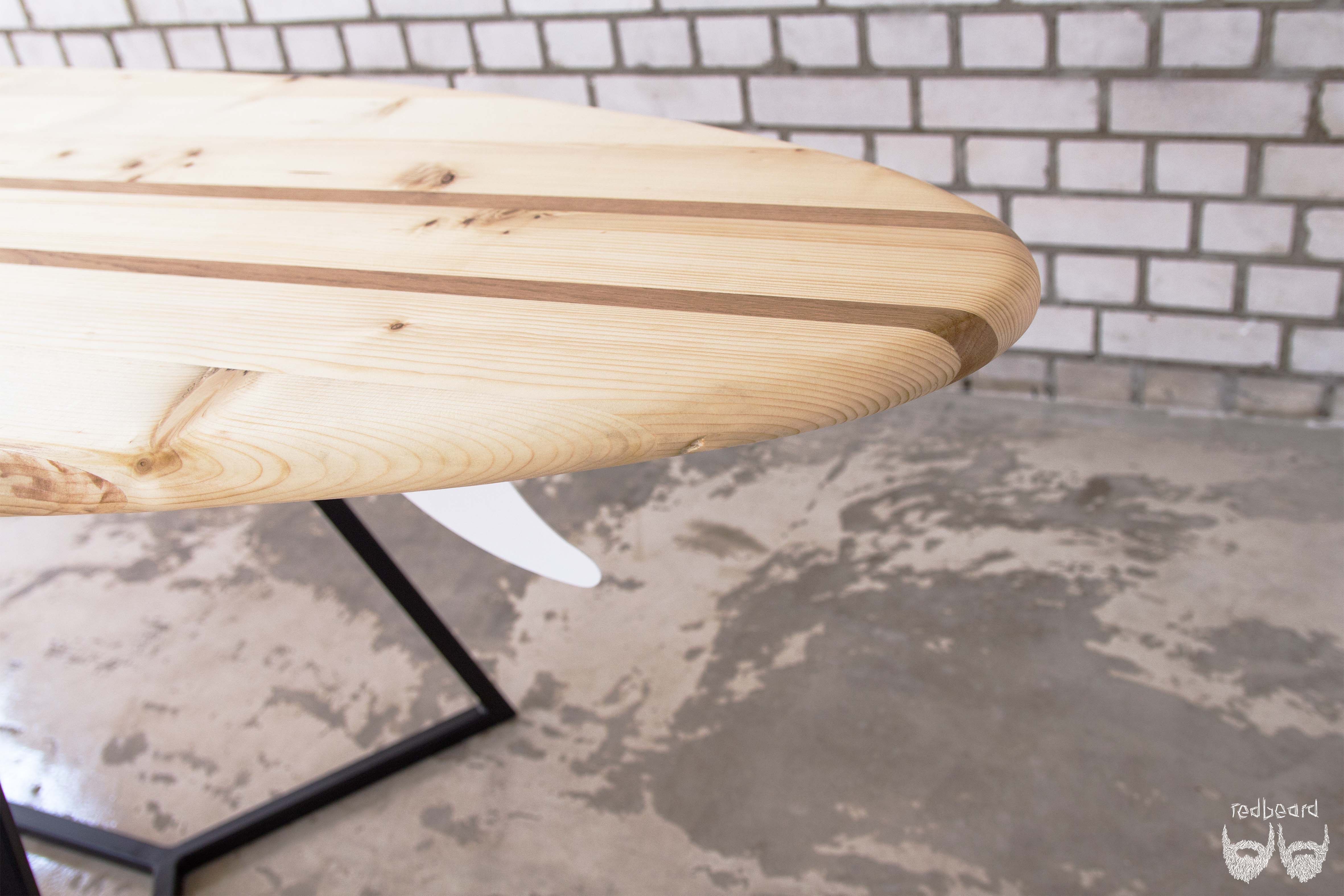 die tischplatte haben wir aus massiver fichte gefertigt, handshaped.