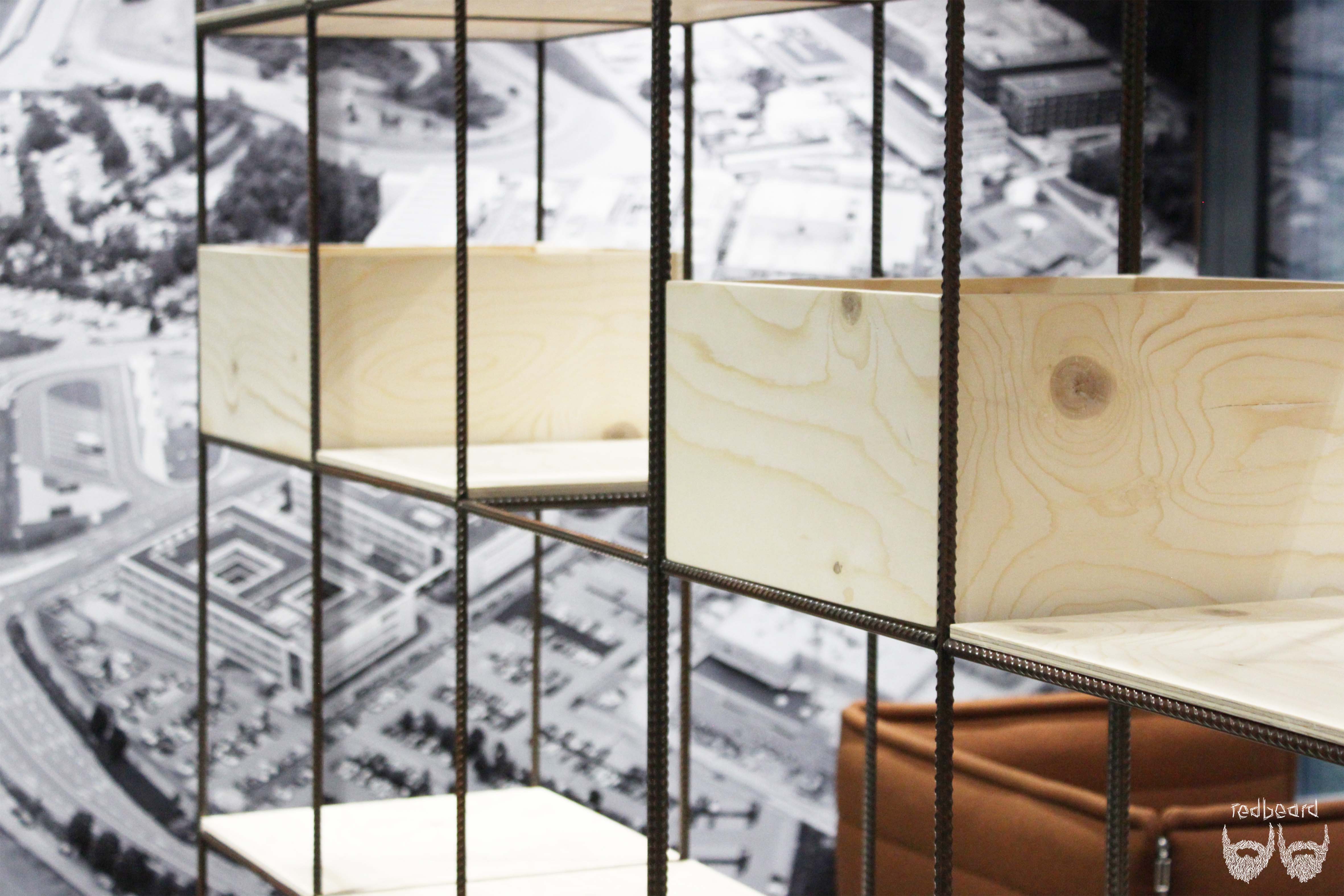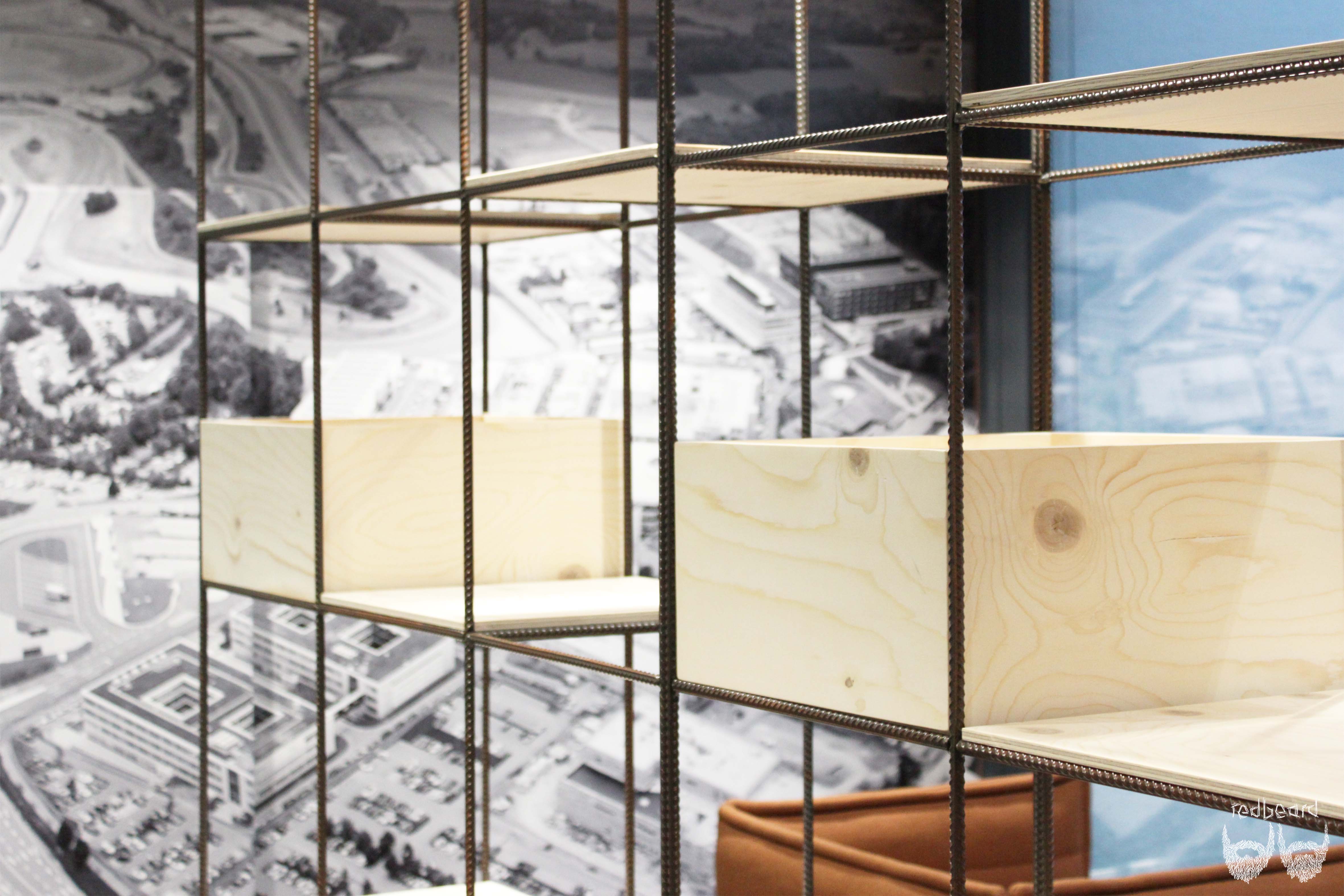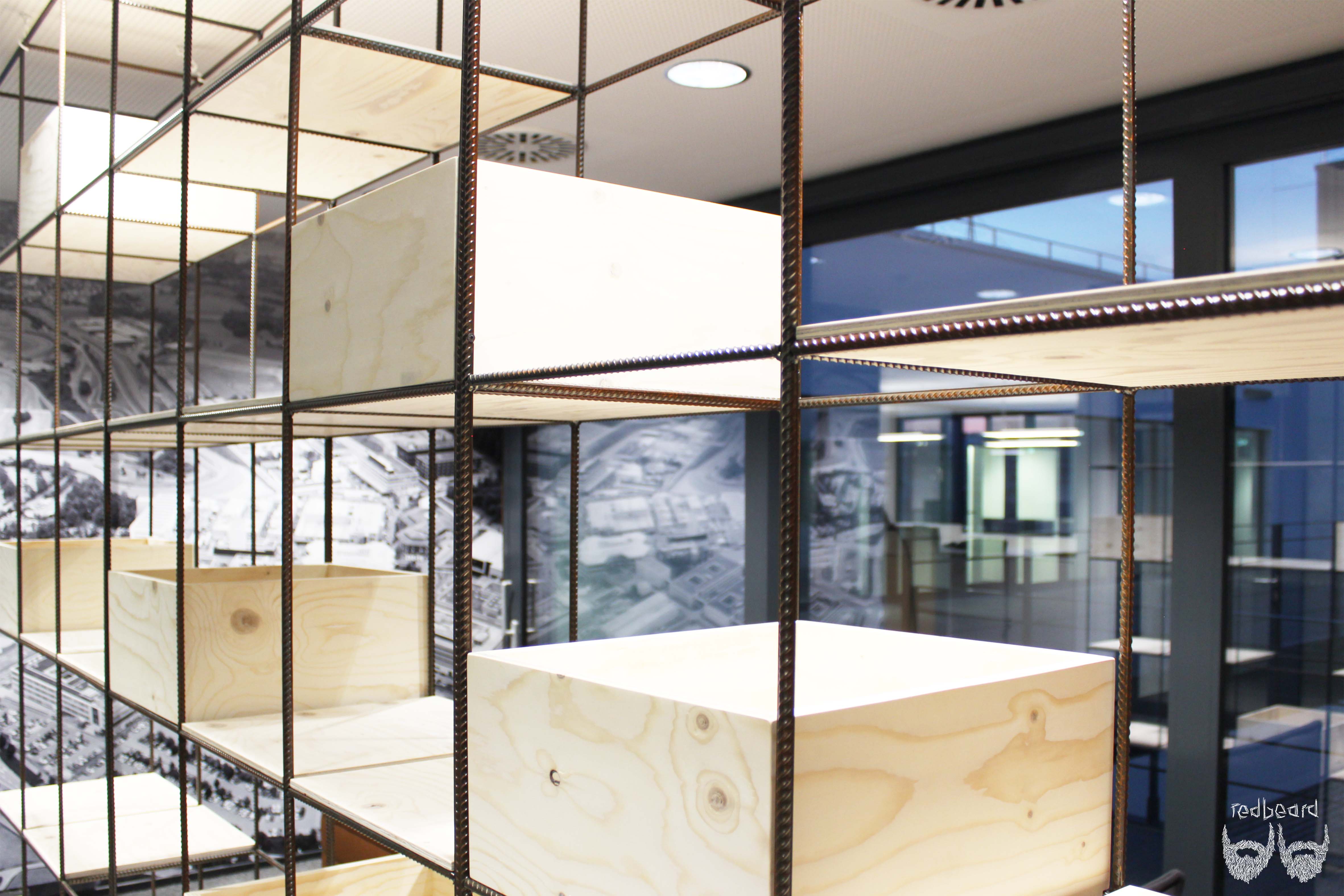 die hölzernen kisten und böden können frei in den rahmen positioniert werden, wodurch das regal sich an die bedürfnisse des nutzers anpasst.