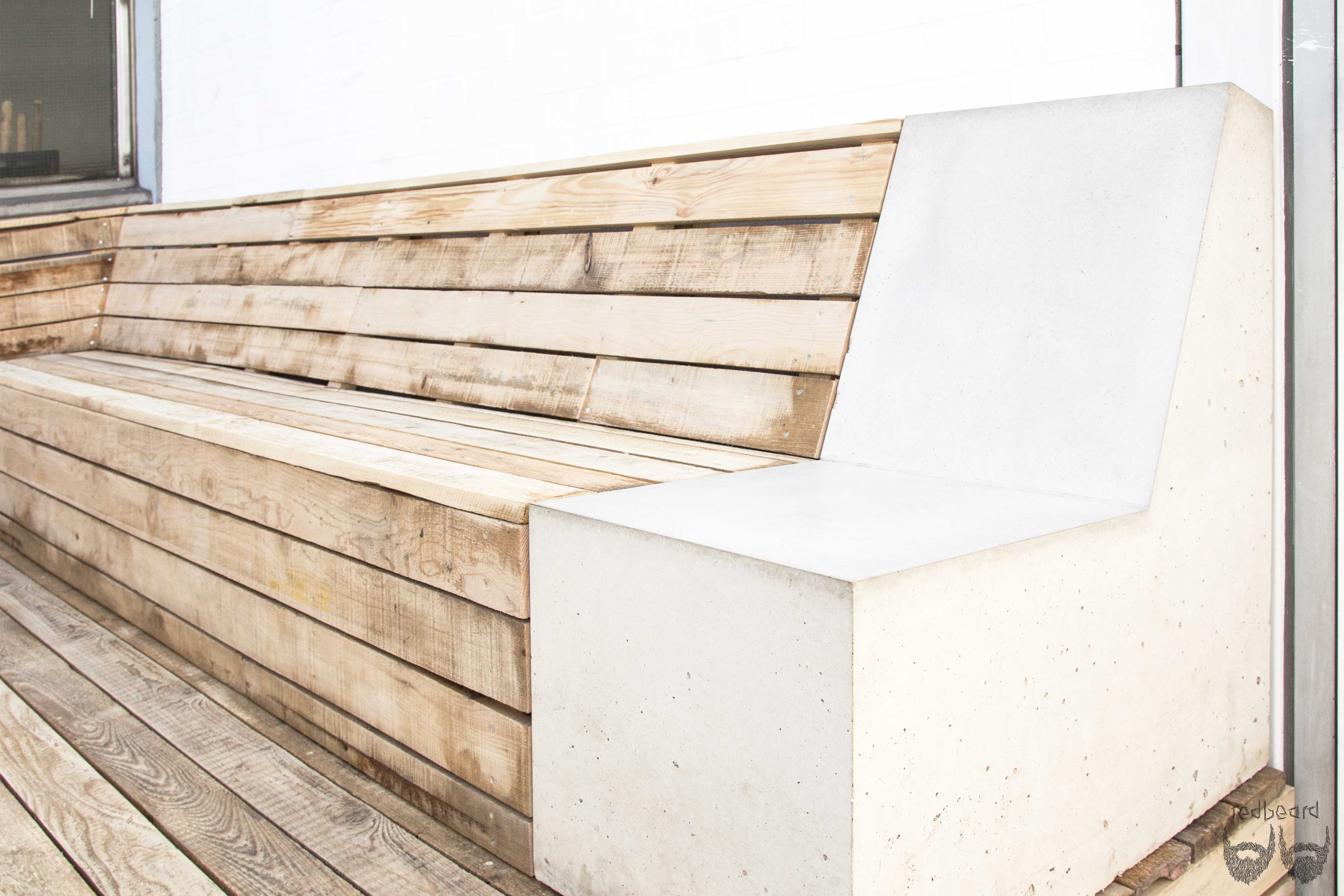 unbehandeltes verwittertes nadelholz wird von zwei betonmonolithen eingefasst und folgt deren linienführung.