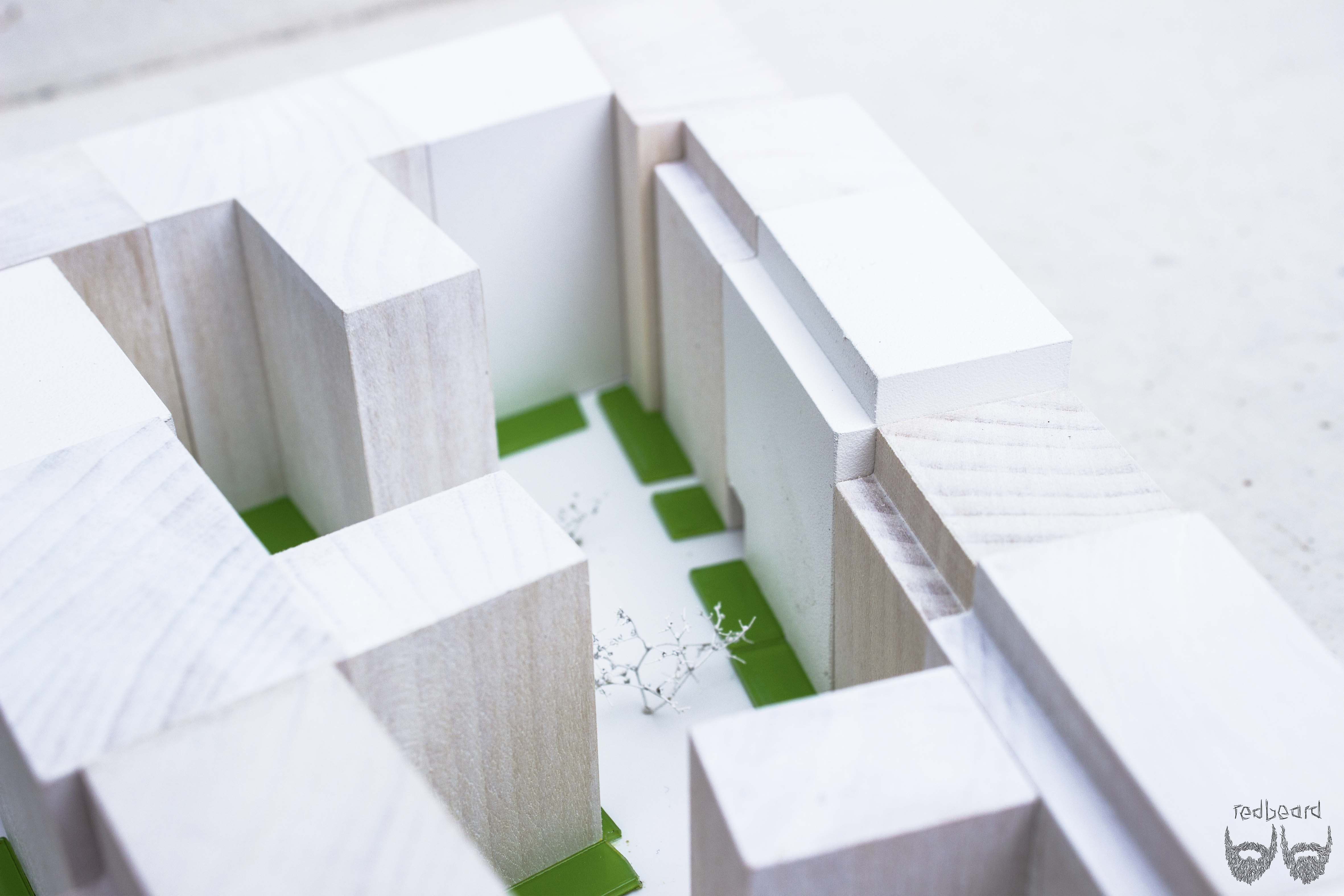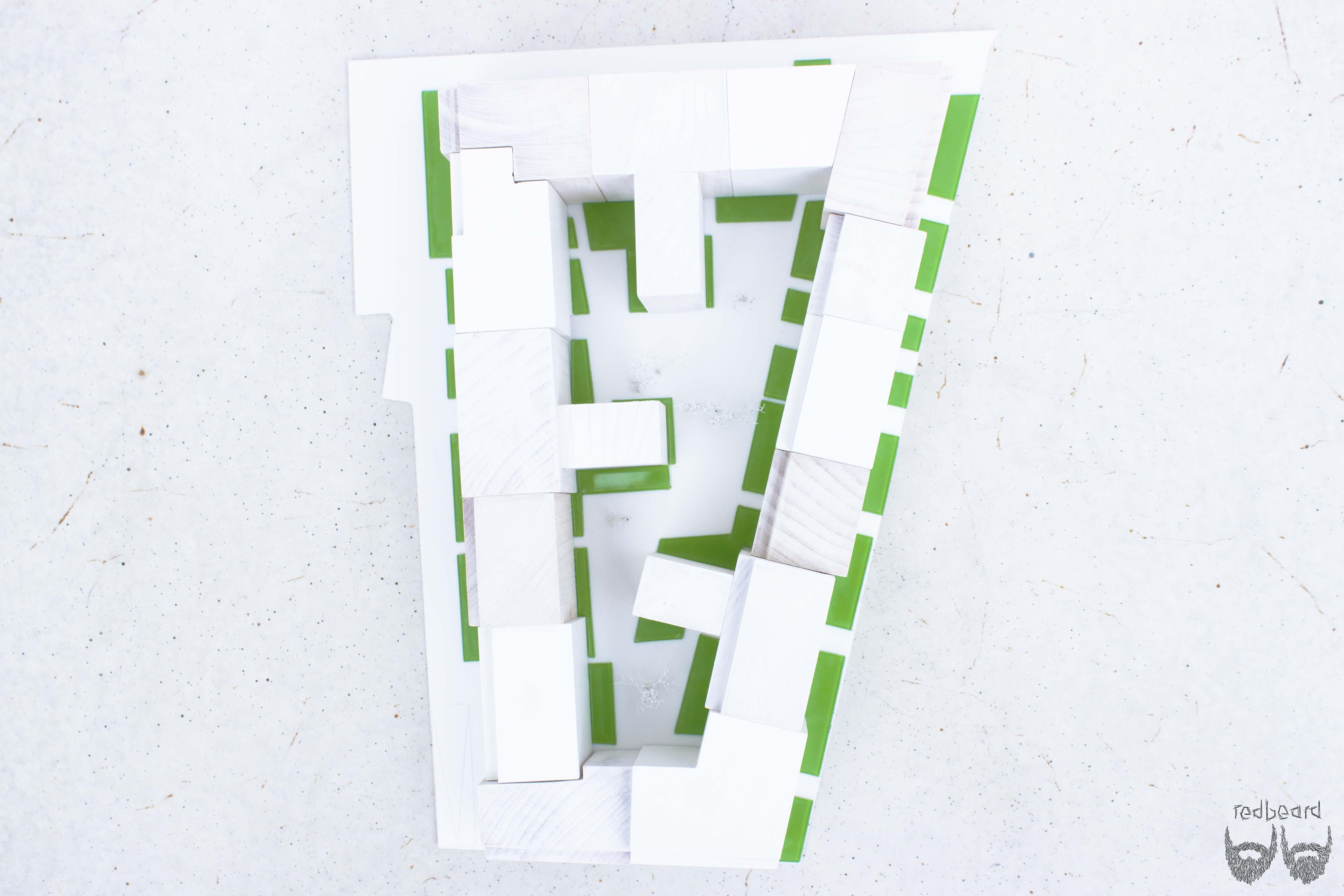 im innehof sind gärten durch grünes acrylglas dargestellt.