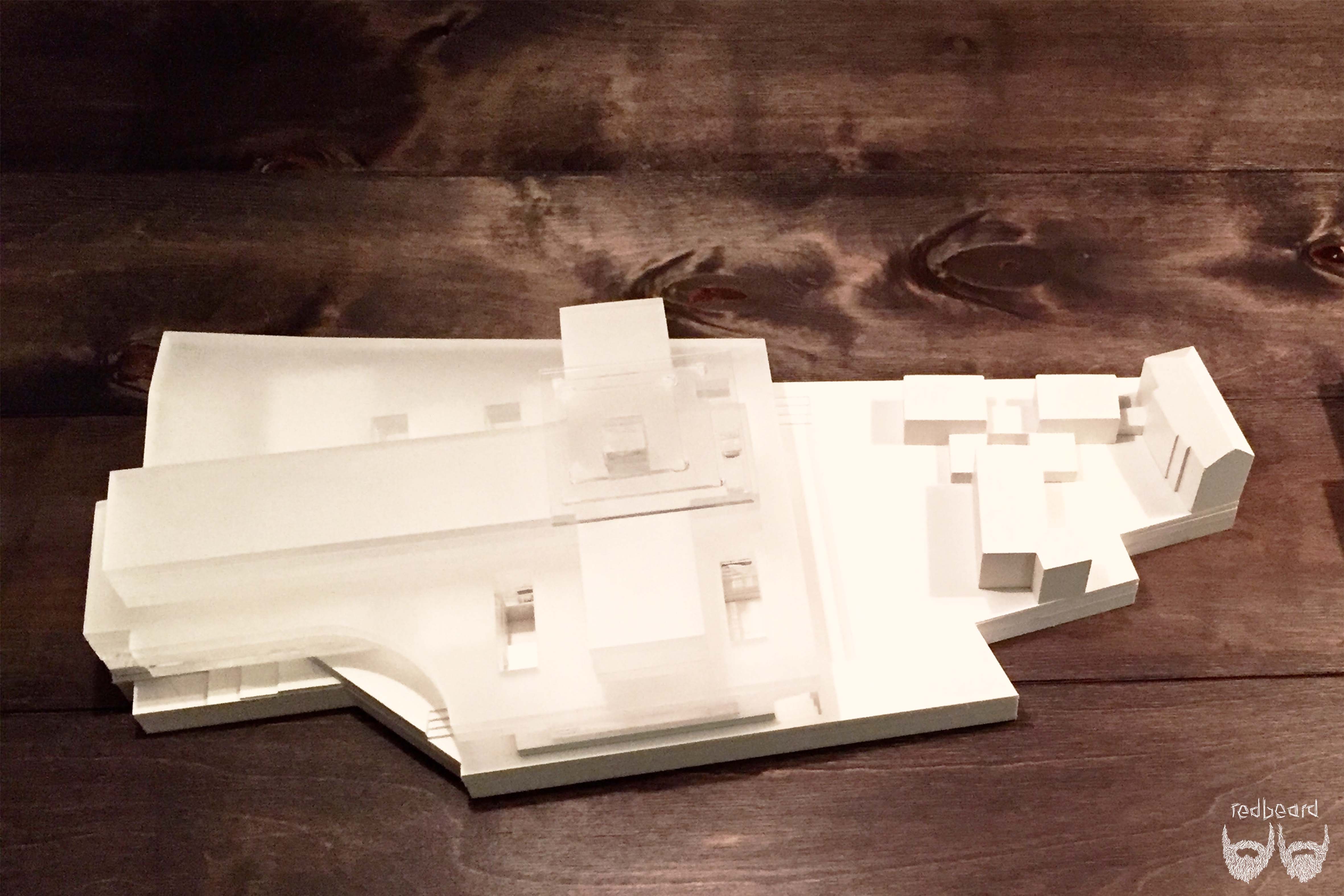 den gläsernen baukörper haben wir mit hilfe von geschliffenen acrylglas in den modellbaumaßstab überführt.