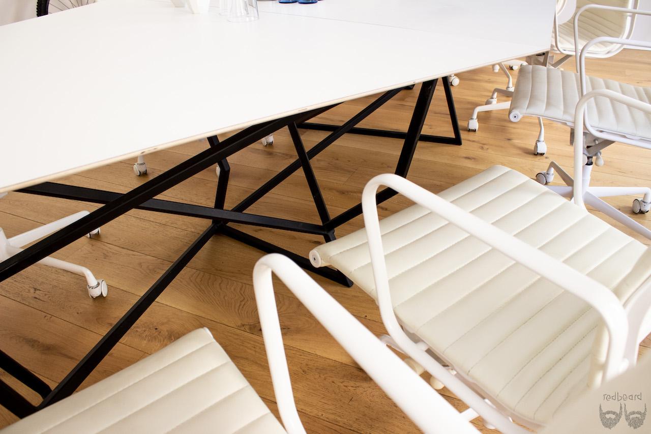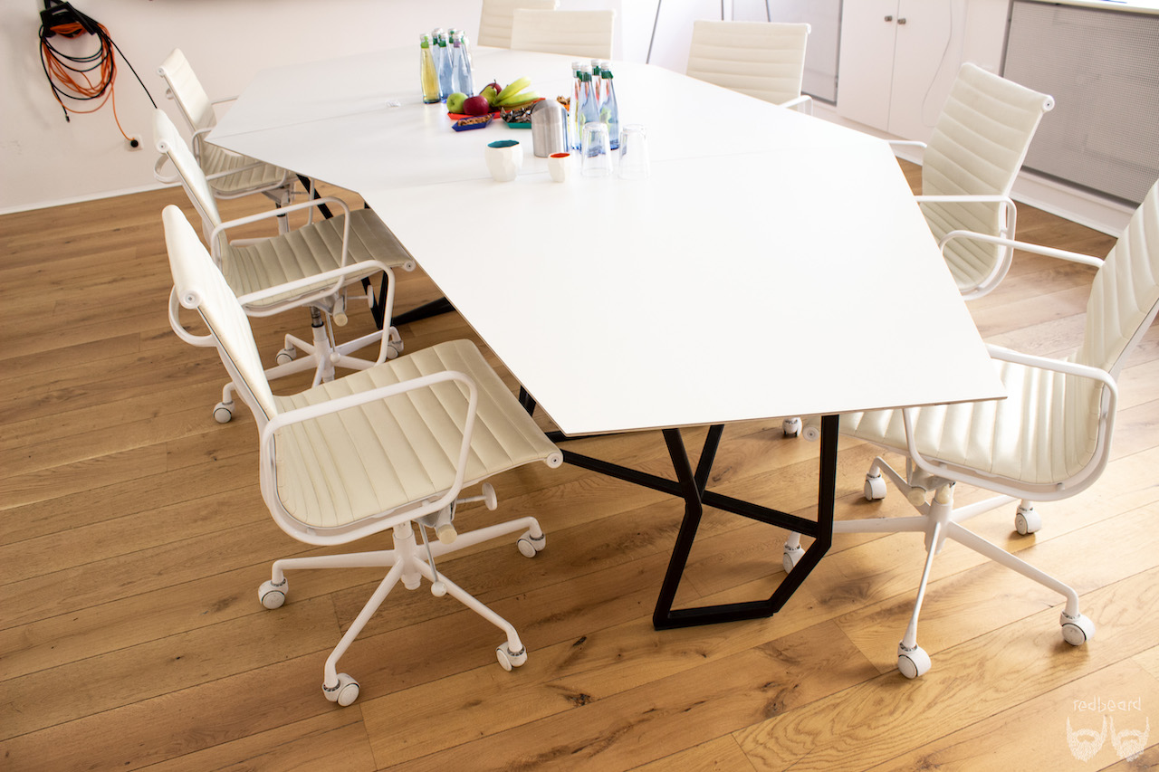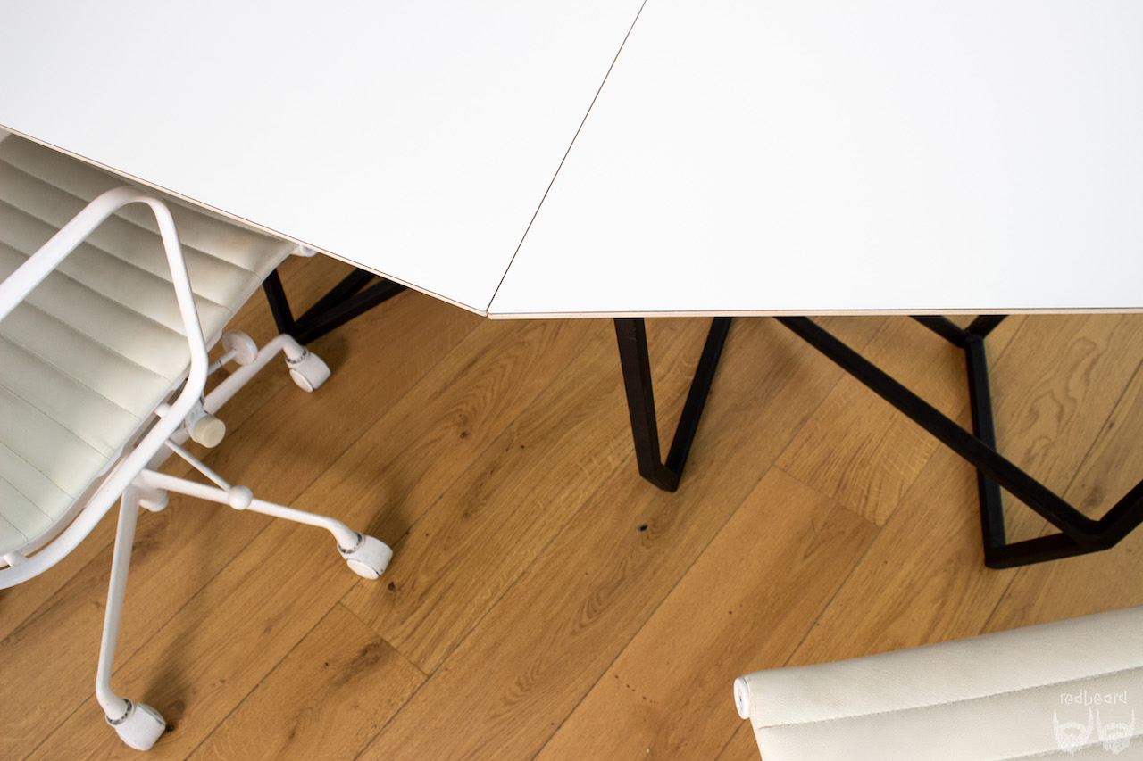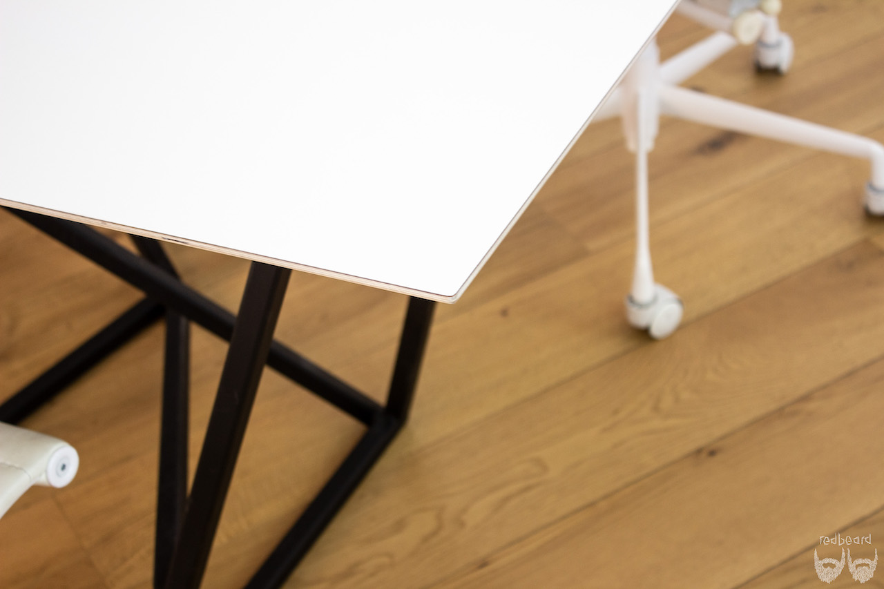 die tischflächen sind aus einer HPL beschichteten multiplexplatte gefertigt und umlaufend mit einem 60° unterschnitt versehen,