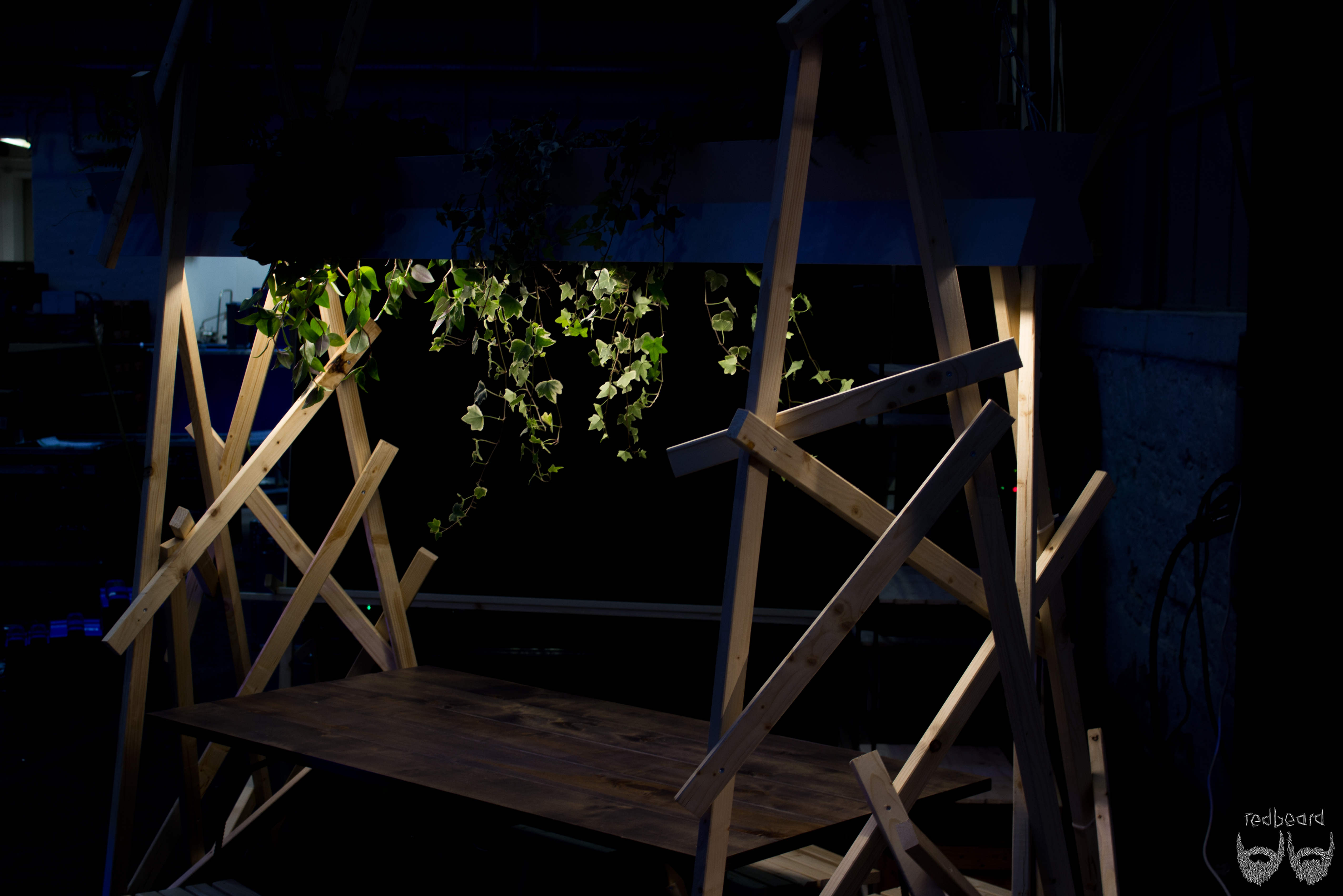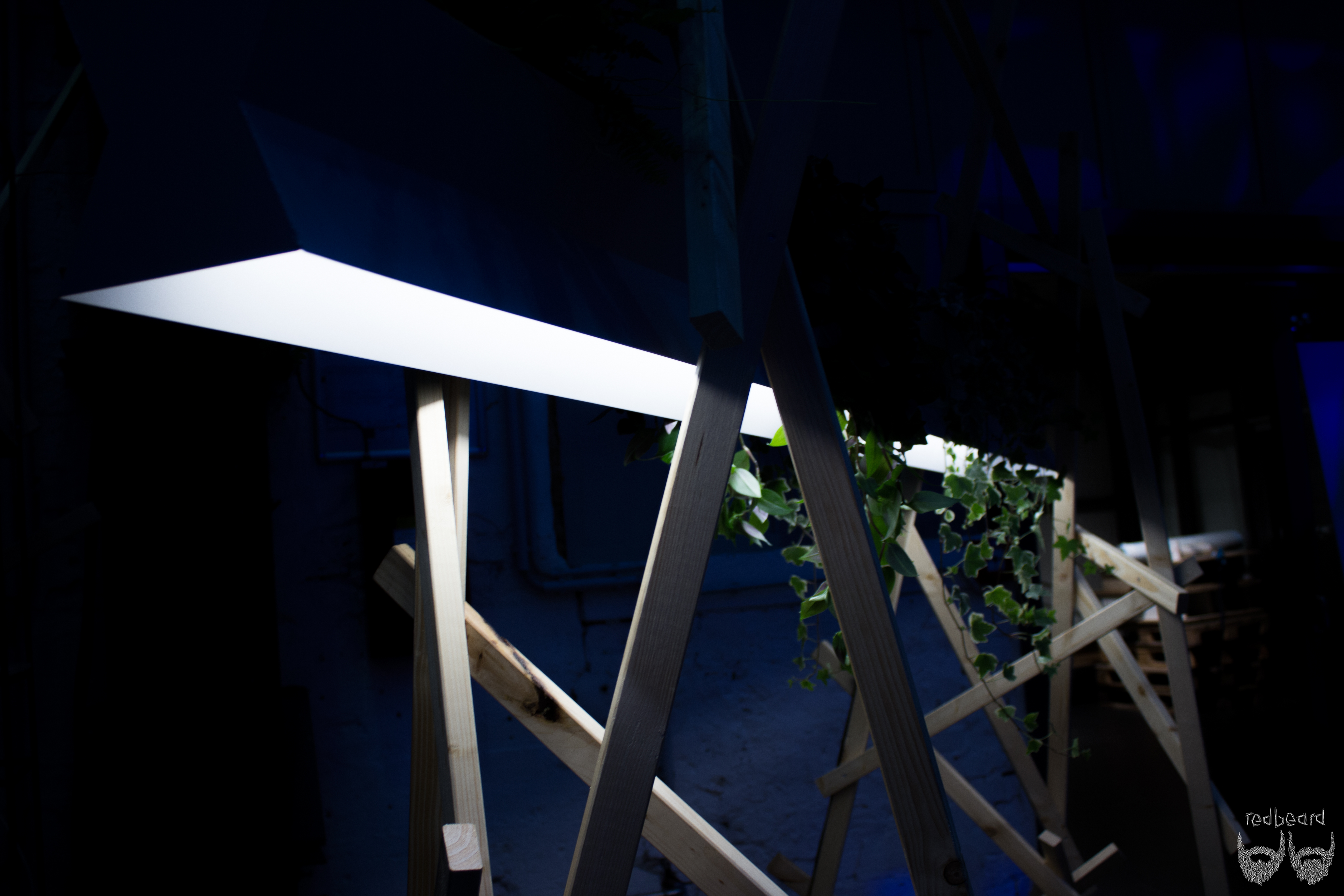 wild verbundene dachlatten bilden das grundkonstrukt, welches optisch nicht in eine standfläche gedrängt ist sondern raumeinnehmend ist.