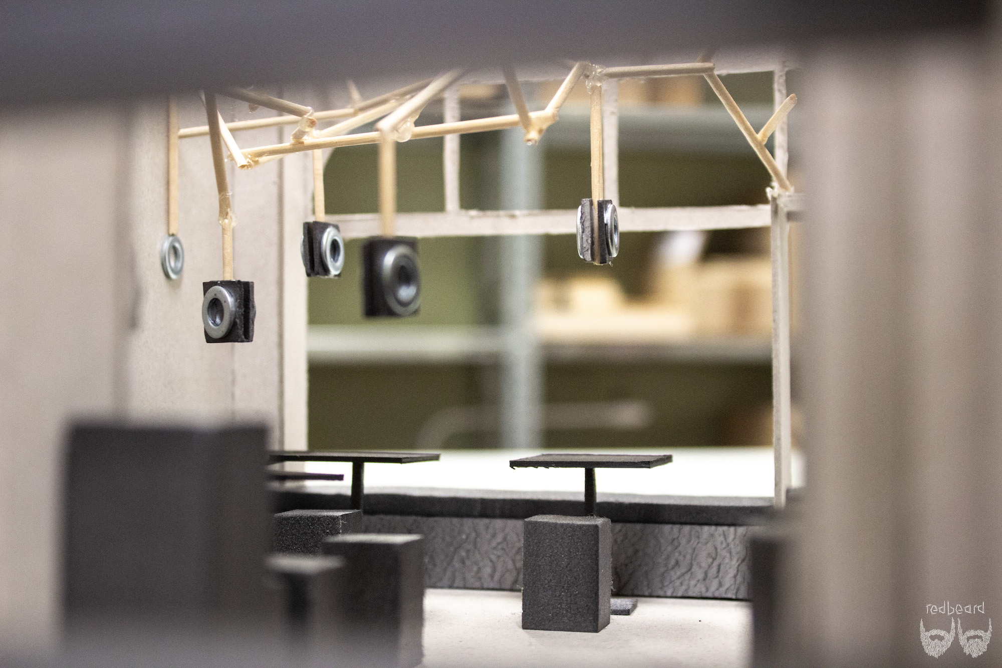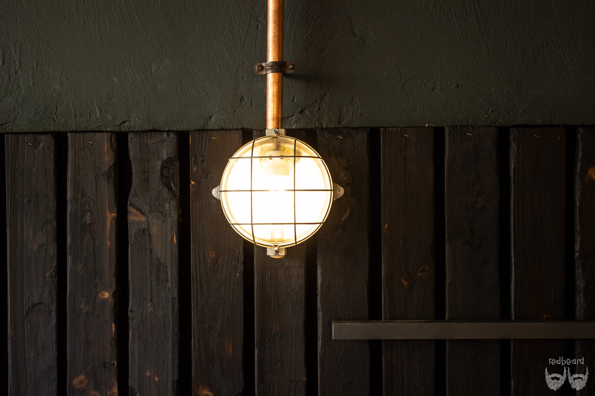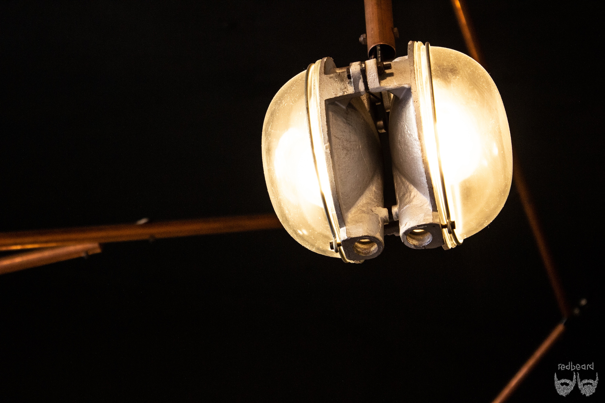 die enden der äste sind jeweils mit aufgearbeitet bunker-leuchten, ebenfalls aus der alten post vor dem abriss gerettet, versehen worden und erhellen den gastraum gerade so stark, dass eine fast schummrige und doch angenehme lichtatmosphäre entsteht.