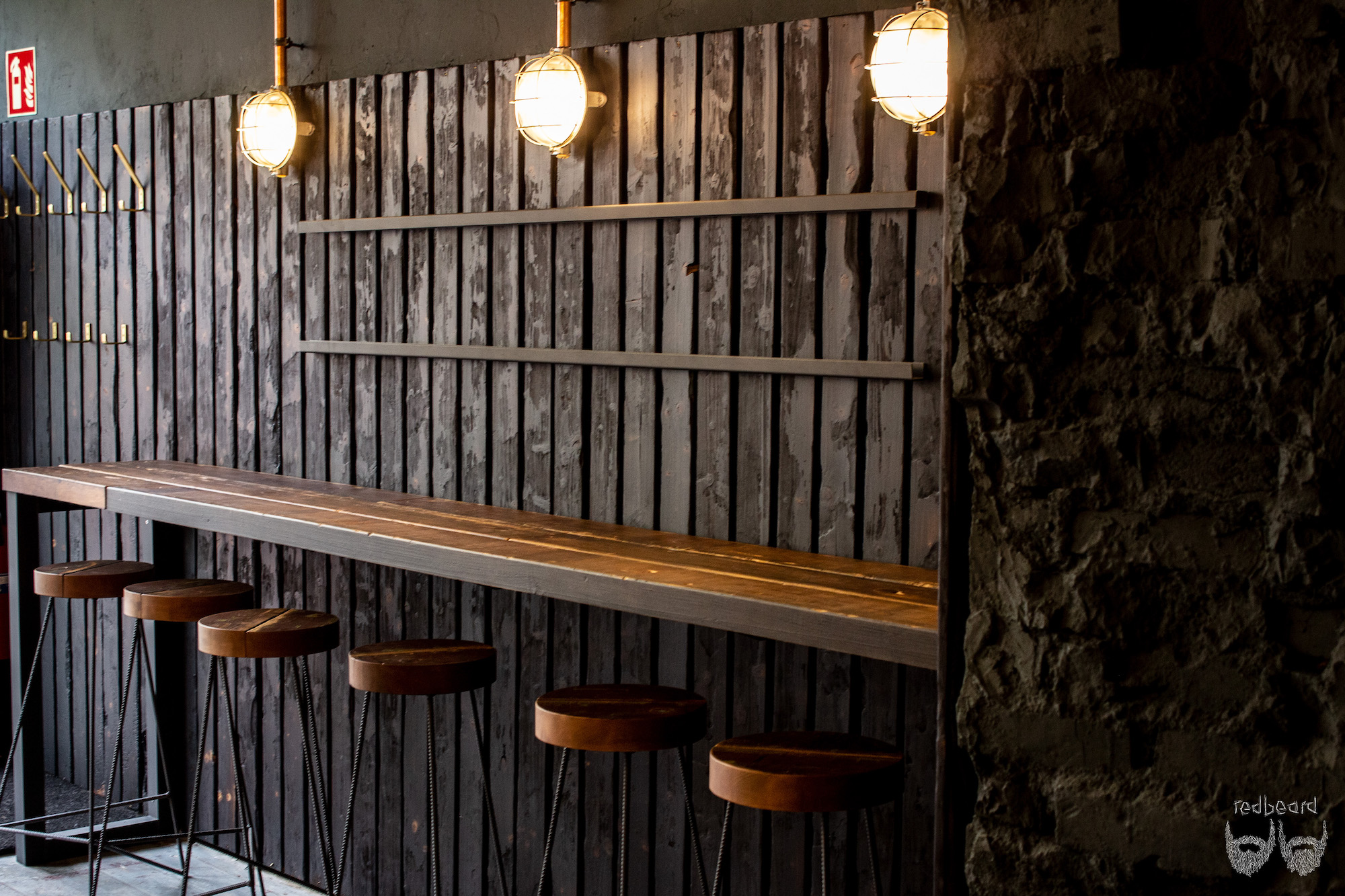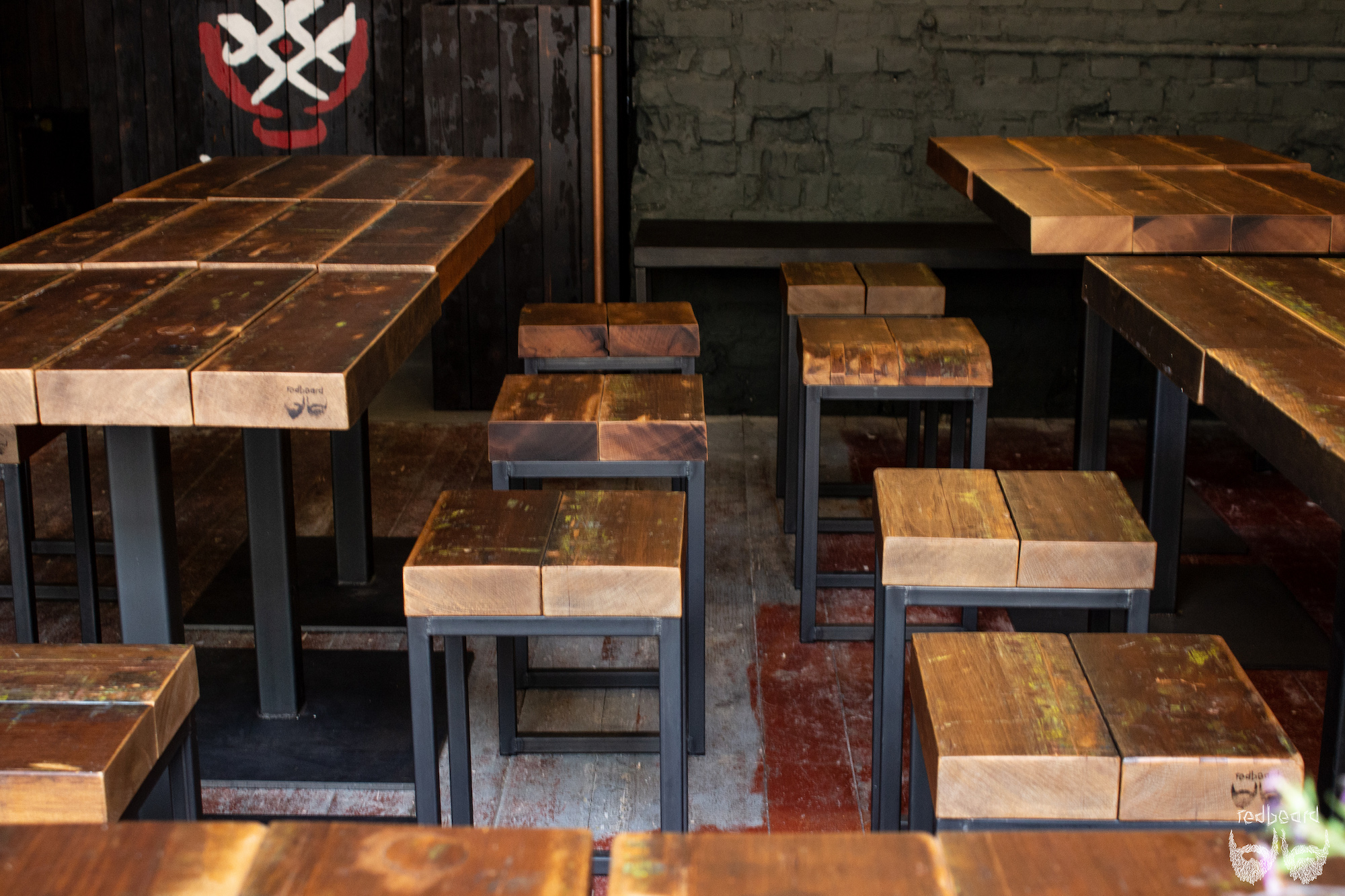 die tische und hocker im gastraum haben wir aus massiven buchenbohlen und schwarzstahl gefertigt.
