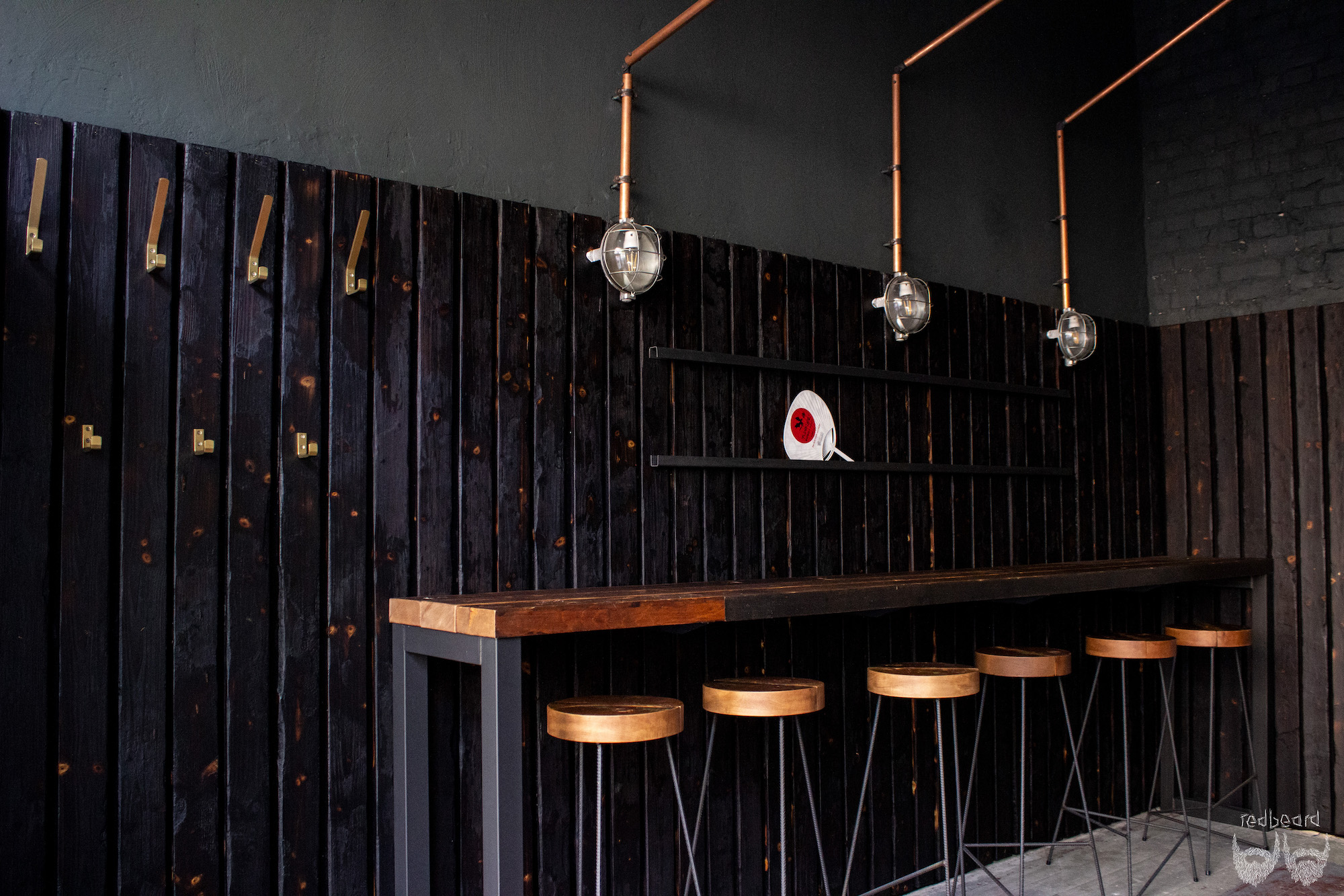 in anlehnung an das feuer beim kochen haben wir eine holzvertäfelung und grillverkleidung aus verkohlten brettern installiert, welches im übrigen auch eine traditionelle japanische art des holzschutzes ist.