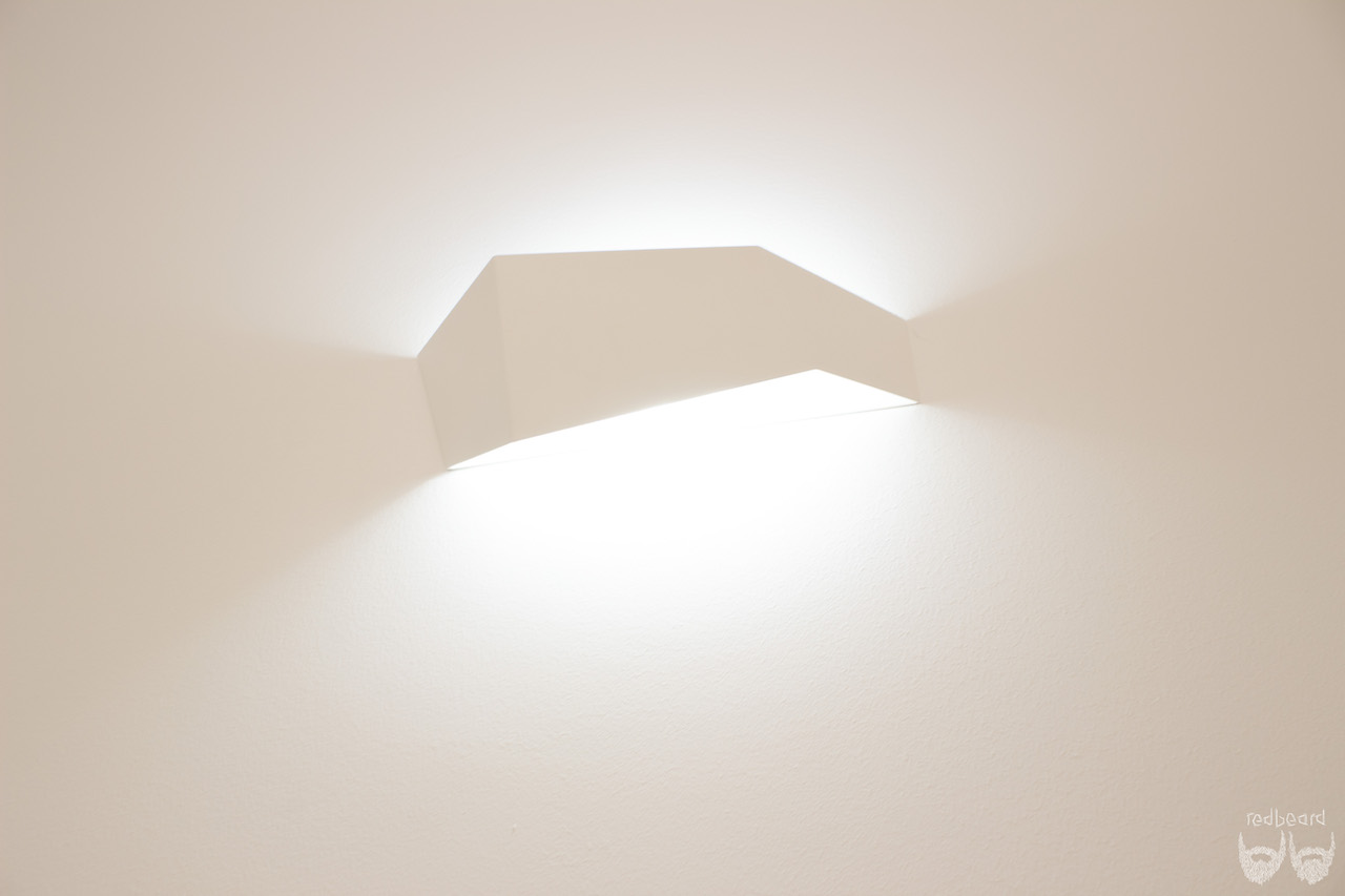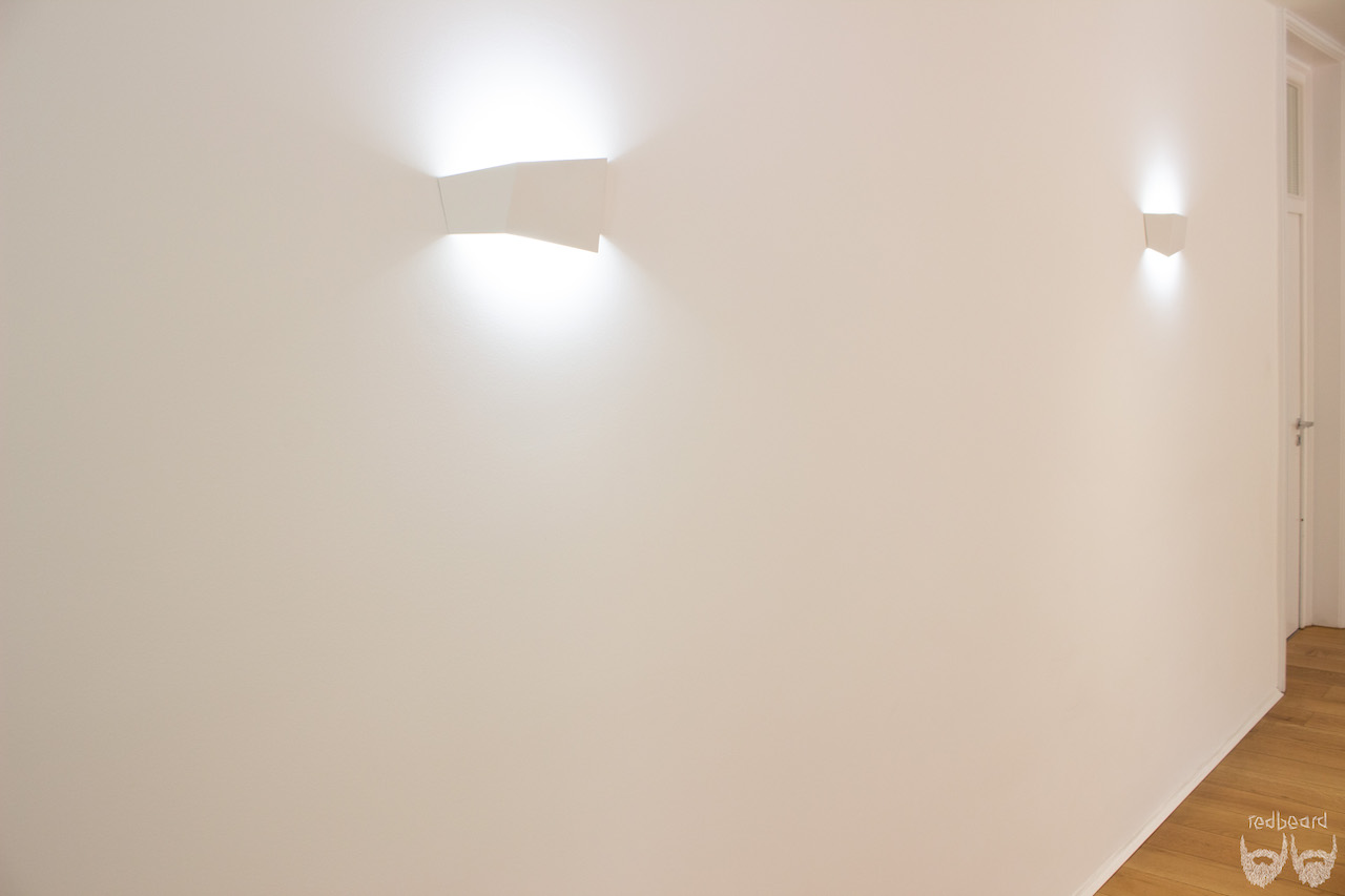 pulverbeschichtet mit einer weißen feinstruktur, bekommt die leuchte nahezu die gleiche haptik wie eine gestrichene wand und hebt sich dadurch nur minimal von dieser ab. gleichzeitig sticht sie über ihre form direkt ins auge.