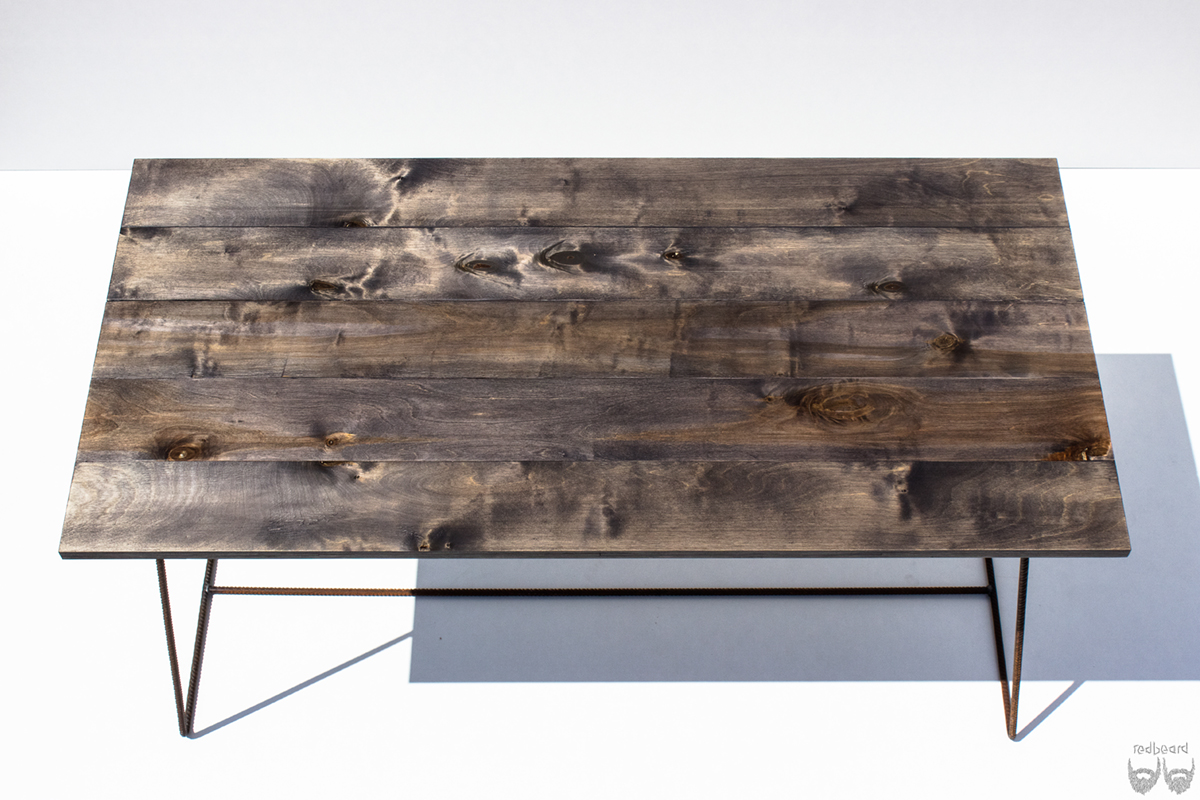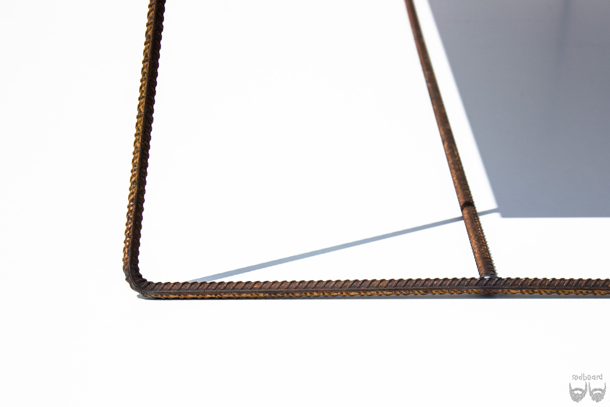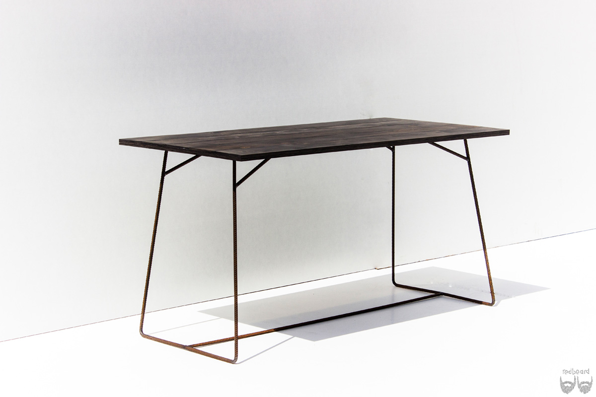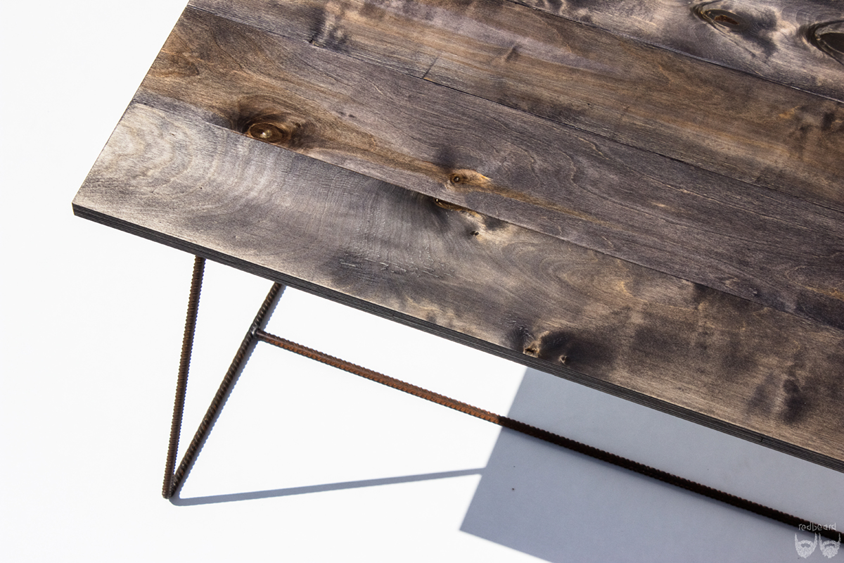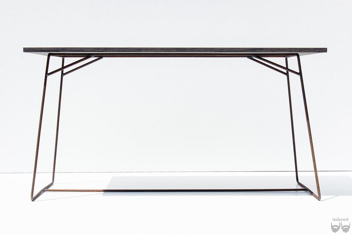 die maserung der ,aus russischem abfallsperrholz verleimten, tischplatte wird durch eine graue beize angefeuert. das handgebogene aus bewehrungstahl gefertige gestell verleiht dem entwurf eine industrielle und gleichzeitig filigrane gestalt.