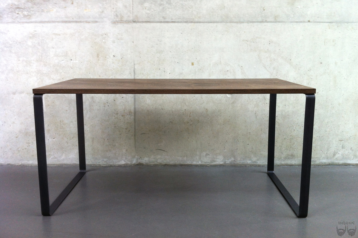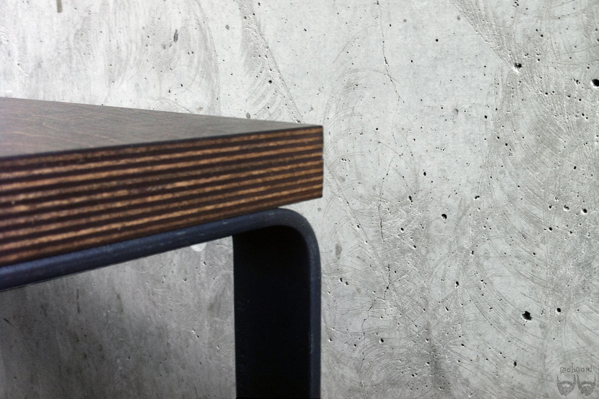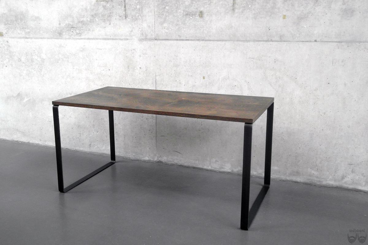 per hand gebogener flachstahl und gebeitze multiplex platte verschmelzen zu modernem ess-arbeitstisch.