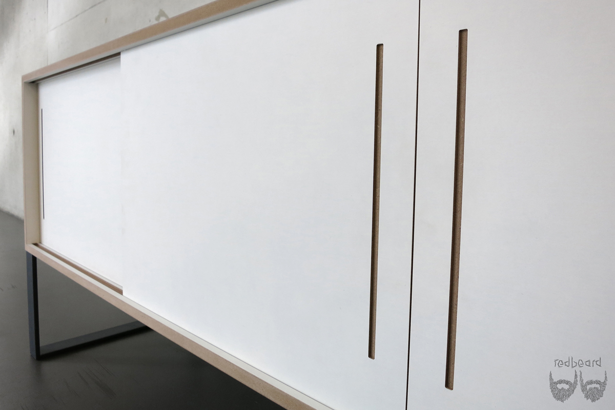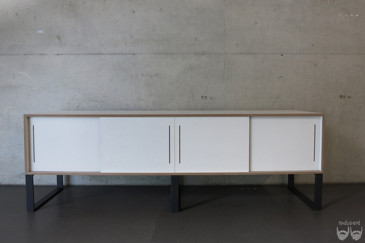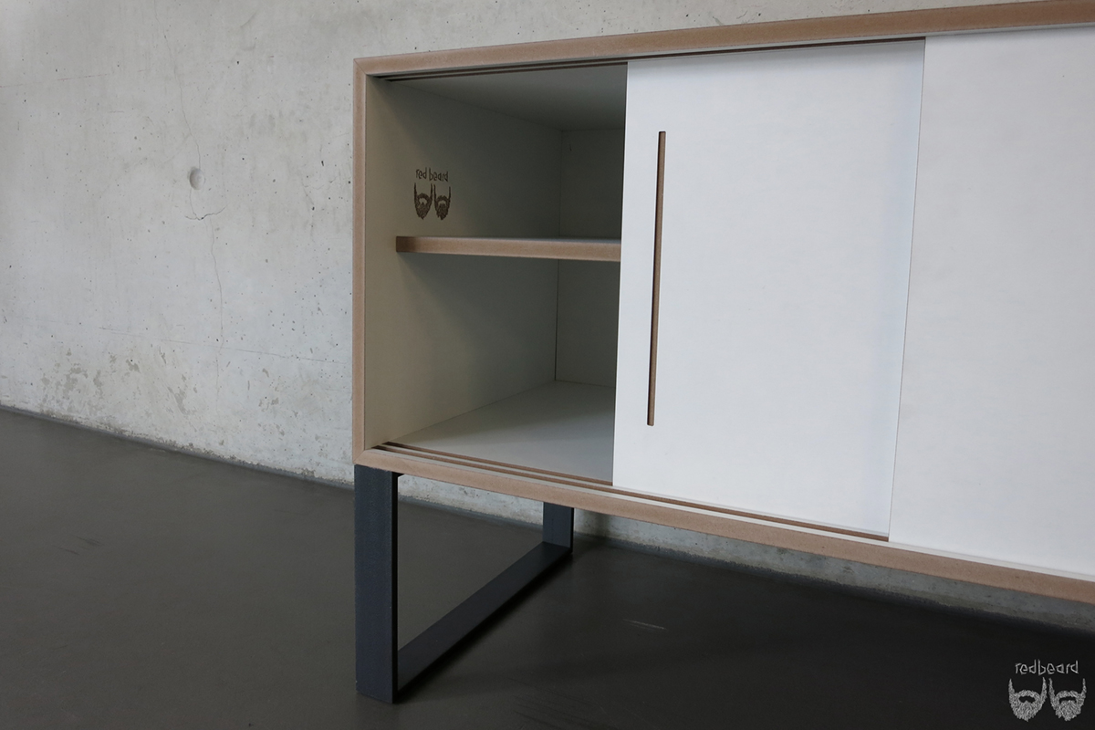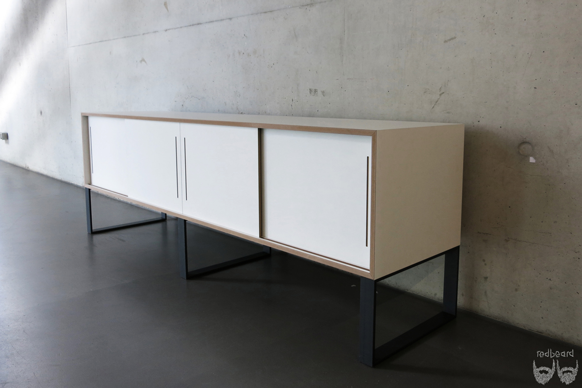 geradlinieges sideboard auf schwarzstahl füßen. die sichtbaren schnittkanten am kubus verdeutlichen die form und rahmen das möbel quasi ein. erna bietet einiges an stauraum und kann über vier schiebetüren geschlossen werden.