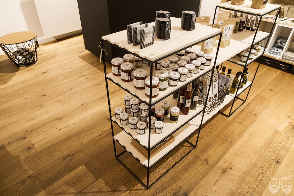 schwarz lackierte schwedische gardinen sehen nicht nur gut aus, sondern bieten auch einiges an stauraum für den shop.
